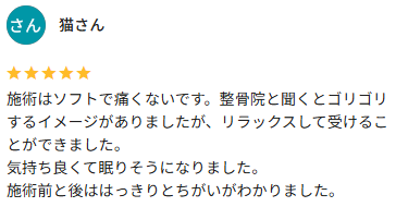 施術と先生の穏やかな語り口調に癒されながらとてもリラックスできました。
